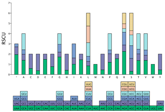 - Parvathy, S.T.; Udayasuriyan, V.; Bhadana, V. Codon usage bias. Mol. Biol. Rep. 2022, 49, 539–565. [Google Scholar] [CrossRef]