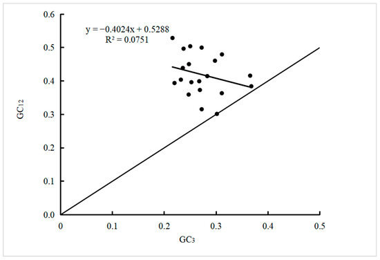 The results of the neutral plot analysis (Figure 4) showed that the value of GC12 ranged from 0.30 and 0.54, and the value of GC3 ranged from 0.22 and 0.37. All gene loci were located above the diagonal of the midline, indicating significant differences in the base composition of the first, second, and third positions of the codon. The regression coefficient between GC12 and GC3 is −0.4024, with an absolute value far less than 1, indicating a very low degree of correlation between the two. Based on the correlation results between GC12 and GC3 in Table 2, it is indicated that the codon usage bias in the plastid genome of D. sinica is mainly affected by natural selection pressure.