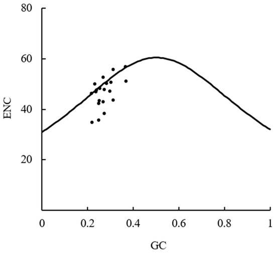 ENC-plot analysis mainly uses image visualization methods to determine the influence of synonymous mutation on codon usage bias. The GC3 of each gene was taken as the x-axis and the ENC value was taken as the y-axis, and a scatter plot was drawn. Meanwhile, according to the formula ENC = 2 + GC3 + 29/[GC32 + (1 − GC3)2], the theoretical values of ENC for each gene were calculated, and standard curves were plotted. If the scatter point is close to the standard curve, it indicates that codon usage bias is mainly affected by mutations, and if the scatter point is far from the standard curve, it is mainly affected by the selection pressure [25].