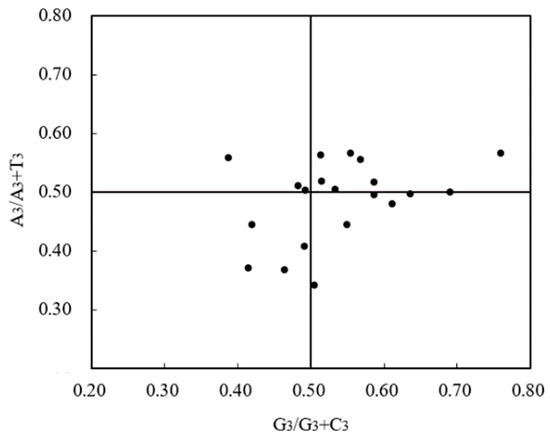 PR2-plot bias analysis can reflect the base composition of the third nucleotide in the codon. With G3/(G3 + C3) as the x-axis and A3/(A3 + T3) as the y-axis for each gene, a scatter plot was drawn. The center point in the figure represents the codon composition state under unbiased conditions, that is, A = T, G = C, while the distance and direction of each scatter point from the center point indicate the degree and direction of bias of the gene [26,27].