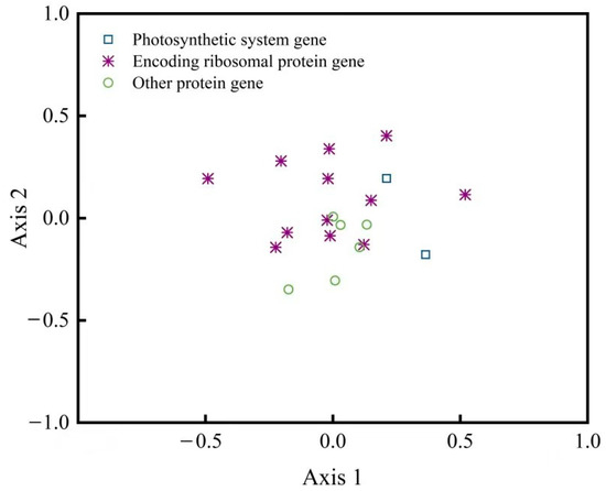 The results of the correspondence analysis showed that the RSCU of each gene codon in the plastid genome of D. sinica could be distributed in a 44-axis vector space, with the contribution rate of the first vector axis, second vector axis, third vector axis, and fourth vector axis being 12.63%, 11.06%, 8.43%, and 7.56%, respectively, and the cumulative difference contribution rate of the first four axes being 39.68%. Using the first and the second vector axes as horizontal and vertical axes, a scatter plot of each gene was plotted (Figure 7). It was found that the distribution of photosynthetic system genes and ribosomal protein-coding gene loci was relatively scattered, indicating that the usage patterns of these gene codons differed significantly.
