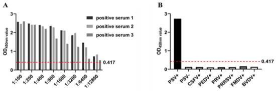 (I) Sera from naïve pigs: Forty-six serum samples were collected from pigs with no virus infection or vaccination. The serum was collected from a pig farm in Shanghai, China, and no neutralizing antibodies were detected in these serum samples. (II) Sera from vaccinated pigs: Seventy-five serum samples were collected at 21–60 dpv from PSV-free pigs after secondary vaccination. Pigs were immunized with a PSV-inactivated vaccine at a PSV-free pig farm in Shanghai. (III) Sera from infected pigs: Sixty-two serum samples were collected at 5–14 dpv from infected pigs. PSV-positive sera were collected from pigs infected with PSV in a pig farm in Shanghai, and the neutralization test confirmed the PSV infection. (IV) Classical swine fever virus (CSFV)-positive serum was purchased from Beijing Kingbaio Biotechnology Co., Ltd. (Bejing, China), and bovine vial diarrhea virus (BVDV)-positive serum was purchased from Ingenasa in Spain; porcine epidemic diarrhea virus (PEDV)-, pseudorabies virus (PRV)-, foot-and-mouth disease virus (FMDV)-, and porcine reproductive and respiratory syndrome virus (PRRSV)-positive sera were stored in a laboratory.