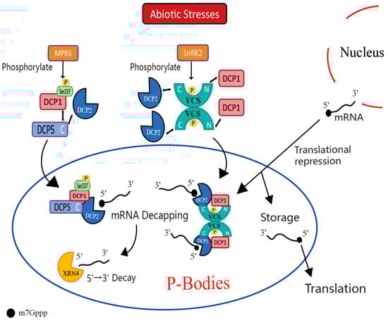 The P-Body responds to abiotic stresses in plants by regulating mRNA uncapping, degradation, translational repression, and storage at the post-transcriptional level. In plant cells, abiotic stresses including osmotic and temperature stresses activate kinase MPK6 and SnRK2 to phosphorylate DCP1 and VCS, respectively, and through this regulate P-Body assembly under stress. Phosphorylated DCP1 interacts with DCP2 and DCP5, and phosphorylated VCS interacts with DCP1 and DCP2, resulting in decapping complexes to excise the 5′-m7Gpp-protecting structure of mRNAs unfavorably resistant or aberrantly transcribed. The decapped mRNA is subsequently degraded by 5′→3′ exoribonuclease XRN4. mRNAs functionally involved in the stress response and mRNAs required for plant growth to adapt to the normal environment are selectively recruited into the P-Body for storage and protection. But whether the mRNAs are degraded or stored in the P-Body, their translation is repressed.