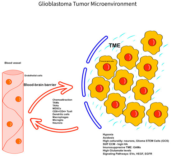 Glioblastoma Tumor Microenvironment: The GBM TME is complex, with a series of unique features, interactions, and components—the ECM, with glycoproteins, proteoglycans, and glycosaminoglycans (e.g., HA), has an important role in creating a barrier between the GBM TME and the normal tissue, promoting invasiveness; the immune cells (GAMs, TANs, monocytes, tumor-infiltrating lymphocytes), neuronal cells, glial cells, and glioma stem cells; chemokines, hormones, enzymes, EVs, and cell-communicating factors like VEGF, EGFR, and mediators like glutamate, with all of them being involved in creating an hypoxic and immunosuppressive TME that promotes tumoral progression and therapy resistance. The blood–brain barrier is also important in modulating the GBM TME components and can limit tissue drug availability, playing an important role in therapy resistance.