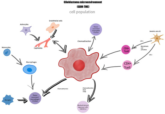 GBM TME has been, for many years, a subject of debate in the journey of finding an effective therapeutic pathway. It is important to understand that the interaction between the TME and tumoral cells greatly influences the invasiveness, tumoral growth, and molecular heterogenicity of GBM [6].