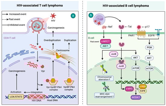 T-cell HALs are less common than B-cell HALs, possibly because T-cell malignant transformation requires the accumulation of more mutations [14]. Recent studies have shown that chronic HIV infection can promote the process of malignant transformation in T cells. HIV primarily infects CD4+ T cells and induces the Vpr-VprBP-Plk4 complex, linking HIV-1 infection with T-cell tumorigenesis through centrosome amplification and aneuploidy [15]. Additionally, the integration of HIV-1 provirus into the first intron of signaling sensors and transcription activators (STAT3) and lymphocyte-specific protein tyrosine kinase (LCK) also plays a crucial role in the development of T-cell lymphomas [16]. In conclusion, HIV-induced mechanisms drive both B- and T-cell malignancies through various pathways, including protein interactions and genomic instability (see Figure 1).