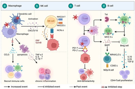 CD4+ T cells infected with HIV show reductions in both quantity and function [32], while CD8+ T cells exhibit overexpression of the inhibitory receptors programmed cell death-1 (PD-1) and suppressor of cytokine signal 7 (SOCS-7), which impairs their killing function [33,34,35]. HIV Tat affects B cells by inhibiting NF-κB pathway activity, reducing MHC class II gene transcription, which hinders immune surveillance [36]. Furthermore, regardless of ART treatment, B-cell activating factor (BAFF) remains elevated in the peripheral blood of HIV-infected individuals compared to healthy controls, leading to significantly reduced expression of NR4A1, NR4A3, and CD83 in marginal zone precursor (MZp) B cells and decreased Breg function, thereby increasing the risk of marginal zone B lymphoma [37,38].