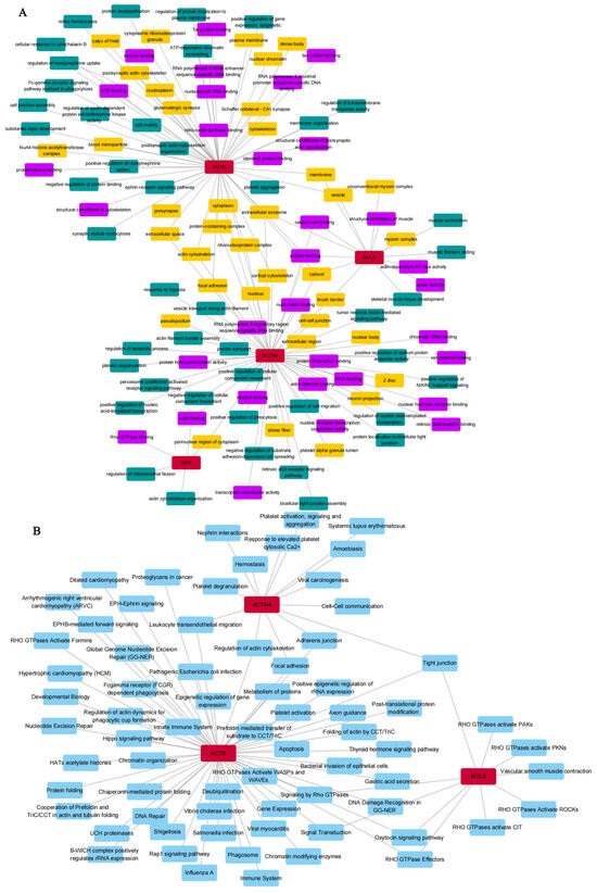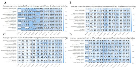 ACTB is highly expressed in all tissues except bone marrow. ACTN4 is expressed at low levels in muscle, brain, testis, heart, pituitary, liver, blood, pancreas, and bone marrow. INF2 is expressed at low levels in all tissues except nerve. MYL6 is expressed at low levels in muscle and bone marrow (less than 50 RPKM) (Supplementary Figure S2). Furthermore, we observed that proteins are expressed differently in various tissues during the fetal stage and adulthood. For example, ACTB expression is highest in cord blood during the fetal period, while it is highest in blood during adulthood (Supplementary Figure S3). In the brain, ACTB is highly expressed in different brain regions and stages (Figure 2A). ACTN4 shows higher protein levels in the hippocampus, with elevated levels in different brain regions during post-conception weeks (PCWs) 28–35 and 19 months to 5 years, stabilizing from youth to adulthood (Figure 2B). INF2 exhibits higher levels in the striatum, with levels increasing and stabilizing after 28–35 PCWs (Figure 2C). MYL6 is present in different brain regions and highly expressed after 10–12 PCWs, with a slight decrease in the expression trend from 12 to 19 years (Figure 2D). ACTB, ACTN4, INF2, and MYL6 are involved in important biological processes such as cell morphology, synaptic regulation, cell movement, and synaptic plasticity in the brain [24,25,26,27].