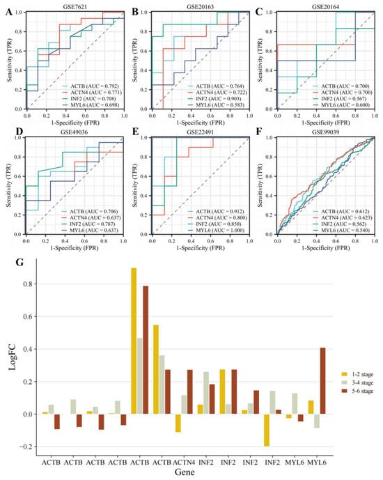 Diagnostic value of DEDRGs in (A) 16 PD and 9 control subjects from the substantia nigra postmortem brain from the GSE7621 dataset; (B) 8 PD and 9 control subjects from the substantia nigra of postmortem brains from the GSE20163 dataset; (C) 6 PD and 5 control subjects from substantia nigra samples from the GSE20164 dataset; (D) control Braak α-synuclein Stage 0: 8 samples; Braak α-synuclein stages 1–2: 5 samples; Braak α-synuclein stages 3–4: 7 samples; Braak α-synuclein stages 5–6: 8 samples from the GSE49036 dataset; (E) 8 PD and 8 control subjects from peripheral mononuclear blood cells from the GSE22491 dataset; (F) 233 healthy controls and 205 idiopathic PD patients from whole blood from the GSE99039 dataset. (G) The expression of DEDRGs from the GSE49036 dataset at different stages. Gene ID: 200801_x_at, 213867_x_at, 224594_x_at, AFFX-HSAC07/X00351_3_at, AFFX-HSAC07/X00351_5_at, AFFX-HSAC07/X00351_M_at, 200601_at, 218144_s_at, 222534_s_at, 222535_at, 224469_s_at, 212082_s_at, 214002_at.