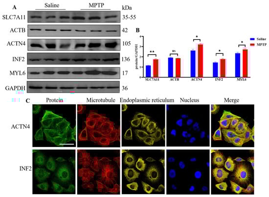 Furthermore, experimental validation of the DEDRGs showed that compared with the saline group, the expression of ACTN4, INF2, and MYL6 increased in the MPTP group (p < 0.05), with ACTB showing a non-significant decrease (Figure 4A,B), although the differences were not statistically significant, likely due to the small sample size. High expression of SLC7A11 leads to significant depletion of intracellular NADPH and abnormal accumulation of cysteine and other disulfide compounds, inducing disulfide stress and rapid cell death. In this study, compared with the saline group, the expression of SLC7A11 increased in the MPTP group (p < 0.01). This sufficiently indicates that DEDRGs have the potential to serve as biomarkers for PD. Finally, an analysis of the distribution of ACTN4 and INF2 in cells using the HPA database revealed that ACTN4 is mainly localized to the actin filaments and additionally to the cytosol, while INF2 is primarily localized to the endoplasmic reticulum and additionally to the nuclear bodies (Figure 4C).