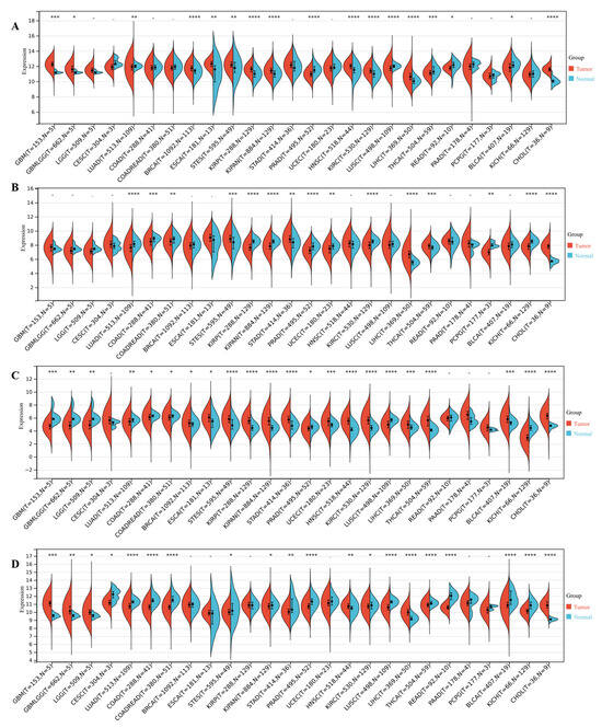 We used the Sanger Box (http://sangerbox.com/, accessed on 8 March 2024) website to analyze the differential expression of DEDRGs in pan-cancer, as follows: We downloaded the uniformly normalized pan-cancer dataset, TCGA Pan-Cancer (PANCAN, N = 10,535, G = 60,499), from the UCSC database. We further screened samples from Solid Tissue Normal, Primary Blood Derived Cancer Peripheral Blood, and Primary Tumor. We performed a log2 (x + 0.001) transformation on each expression value. Additionally, we excluded cancer types with fewer than 3 samples in a single cancer type, resulting in expression data for 26 cancer types. Next, we extracted the expression data of the genes ENSG0000075624 (ACTB), ENSG000000130402 (ACTN4), ENSG0000092841 (MYL6), and ENSG0000003485 (INF2) from each sample. Using R software (version 3.6.4), we calculated the expression differences between normal and tumor samples in each tumor, using non-paired Wilcoxon Rank Sum and Signed Rank Tests for differential significance analysis.
