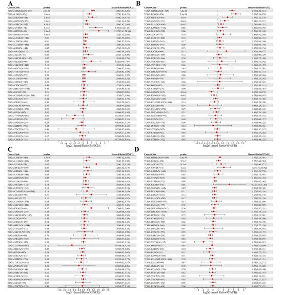 Pan-cancer prognostic analysis of DEDRGs using univariate Cox regression, including (A) ACTB, (B) ACTN4, (C) INF2, and (D) MYL6.
