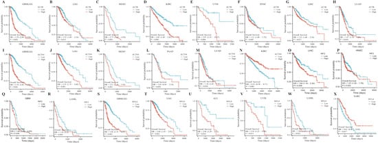 Survival analysis of DEDRG expression in pan-cancer. (A–H) Survival curves of ACTB in GBMLGG, LGG, MESO, KIRC, UVM, HNSC, LIHC, LUAD. (I–N) Survival curves of ACTN4 in GBMLGG, LGG, MESO, PAAD, LUAD, KIRC. (O–R) Survival curves of INF2 in LIHC, HNSC, GBM, LAML. (S–X) Survival curves of MYL6 in GBMLGG, LGG, ACC, UVM, LAML, SARC.