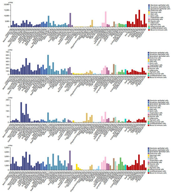 In single-cell type analysis, we analyzed the expression of DEDRGs mainly from glandular epithelial cells, squamous epithelial cells, specialized epithelial cells, endocrine cells, neuronal cells, glial cells, germ cells, trophoblast cells, endothelial cells, muscle cells, adipocytes, pigment cells, mesenchymal cells, undifferentiated cells, and blood and immune cells. ACTB is highly expressed in various cells, including distal enterocytes, suprabasal keratinocytes, alveolar cells type 1, pancreatic endocrine cells, horizontal cells, Schwann cells, oocytes, extravillous trophoblasts, endothelial cells, smooth muscle cells, adipocytes, melanocytes, fibroblasts, undifferentiated cells, and Hofbauer cells (Figure 9). ACTN4 is highly expressed in various cells, including distal enterocytes, suprabasal keratinocytes, type 1alveolar cells, pancreatic endocrine cells, excitatory neurons, Muller glia cells, spermatocytes, extravillous trophoblasts, endothelial cells, smooth muscle cells, adipocytes, melanocytes, endometrial stromal cells, undifferentiated cells, and dendritic cells (Figure 9). INF2 is highly expressed in various cells, including gastric mucus-secreting cells, type 1 alveolar cells, enteroendocrine cells, excitatory neurons, oligodendrocytes, spermatogonia, extravillous trophoblasts, lymphatic endothelial cells, smooth muscle cells, adipocytes, melanocytes, fibroblasts, undifferentiated cells, and Langerhans cells (Figure 9). MYL6 is highly expressed in various cells, including distal enterocytes, suprabasal keratinocytes, ductal cells, pancreatic endocrine cells, cone photoreceptor cells, Schwann cells, late spermatids, extravillous trophoblasts, endothelial cells, smooth muscle cells, adipocytes, melanocytes, peritubular cells, undifferentiated cells, and Hofbauer cells (Figure 9). A single-cell tissue overview is shown in Supplementary Figure S6.