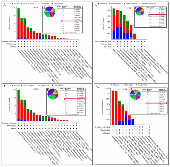 Gene mutation analysis of DEDRGs. (A) The pan-cancer mutation status of ACTB was determined using the cBioPortal tool. (B) ACTB base mutation frequency. (C) The pan-cancer mutation status of ACTN4 was determined using the cBioPortal tool. (D) ACTN4 base mutation frequency. (E) The pan-cancer mutation status of INF2 was determined using the cBioPortal tool. (F) INF2 base mutation frequency. (G) The pan-cancer mutation status of MYL6 was determined using the cBioPortal tool. (H) MYL6 base mutation frequency.