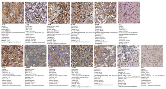 Tumor pathological staining of ACTB in glioma, renal cancer, head and neck cancer, liver cancer, and lung cancer; ACTN4 in glioma, pancreatic cancer, lung cancer, and renal cancer; INF2 in liver cancer, head and neck cancer, and glioma; MYL6 in glioma (scale bar, 20 µm).