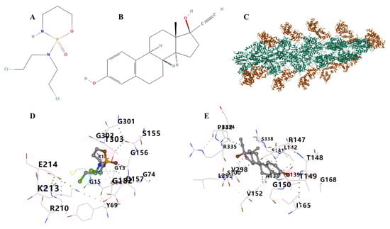 Binding mode of screened drugs to their targets by molecular docking. (A) The structure of cyclophosphamide. (B) The structure of ethinyl estradiol. (C) The structure of ACTB (3byh). (D) Molecular docking results of ACTB and cyclophosphamide. (E) Molecular docking results of ACTB and ethinyl estradiol.