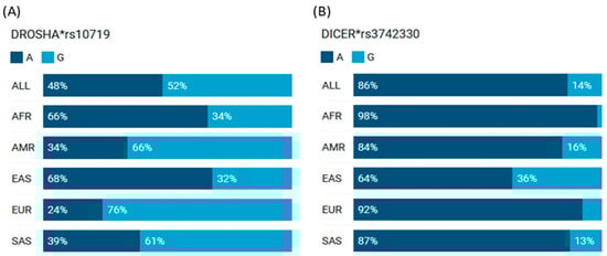 The allele frequencies of DROSHA rs10719 and DICER rs3742330 variants in different populations. (A) DROSHA (B) DICER. AMR: American; AFR: African; EAS: East Asian; EUR: European; SAS: South Asians. Data source: 1000 Genomes Project Phase 3 allele frequencies [Ensembl.org] (last accessed on 20 March 2024)”. *rs: reference sequence.