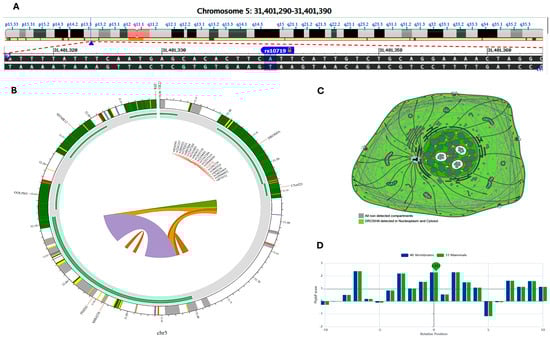 The DROSHA ribonuclease III gene (ENSG00000113360) is located on chromosome 5p13.3: 31,400,494–31,532,093 (reverse strand, Figure 2A). It is implicated in the initial processing step of microRNA (miRNA) biogenesis (gene ontology (GO): 0006396). The studied variant rs10719 (NC_000005.10: g.31401340 A: G) is present in the three prime untranslated region. A customizable ‘Circos plotting system’ was established utilizing “3DSNP 2.0′ (https://omic.tech/3dsnpv2/)” (accessed 30 March 2024) to visualize the 3D chromatin structure along with a selection of crucial chromatin marks around the SNP of interest (Figure 2B). For predicting transcription factors, breast tissue was chosen as the cell type, while epithelial cells were selected for the assessment of histone modification. The primary subcellular localization of DROSHA, with a high confidence level, is found in the nucleoplasm and cytosol (Figure 2C). Its “PhyloP conservation score” is 2.277 (Figure 2D). The absolute values of this score correspond to “−log(p-value) under a null hypothesis of neutral evolution”. Positive scores indicate predicted conserved sites, whereas negative scores are assigned to regions anticipated to evolve rapidly.