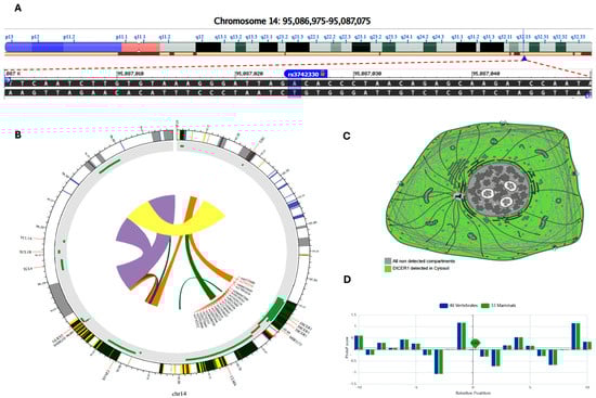 Regarding the DICER ribonuclease III gene (ENSG00000100697), it is located on chromosome 14q32.13: 95,086,228–95,158,010 (reverse strand, Figure 3A). It is implicated in short dsRNA-mediated post-transcriptional gene silencing (GO:0006396). The studied variant rs3742330 (NC_000014.9:95087024 A: G) is present in the three prime untranslated region. A customizable Circos plotting system was created utilizing “3DSNP 2.0 (https://omic.tech/3dsnpv2/)” (accessed 30 March 2023) to visualize the 3D chromatin topology, along with crucial chromatin marks surrounding the SNP of interest (Figure 3B), based on the previously mentioned selection criteria. The primary subcellular localization of DICER, with a high degree of confidence, is found in the cytosol (Figure 3C). Its “PhyloP conservation score” is −0.023 (Figure 3D).