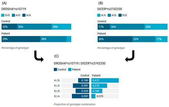 Genotype combination analysis of DICER and DROSHA genes in tissues of BC women. (A) Distribution of DROSHA genotypes in patients and controls. (B) Distribution of DICER genotypes in patients and controls. (C) Distribution of combined DROSHA and DICER genotypes in patients and controls. *rs: reference sequence.