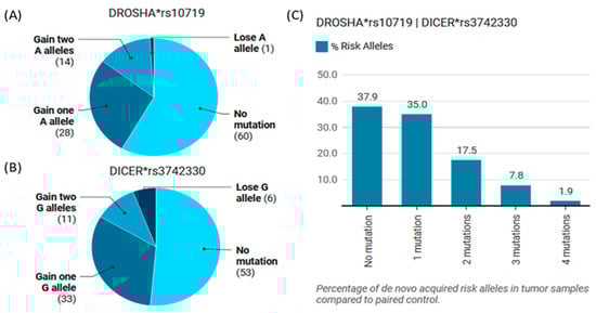 Somatic mutation analyses of DICER and DROSHA polymorphisms in paired tissues of women with BC. (A) Genotype alteration of the DROSHA gene in cancer and non-cancer tissues. The A allele is considered the risky variant. (B) Genotype alteration of DICER gene in cancer and non-cancer tissues. G allele is considered the risky variant. (C) Genotype alteration of combined DROSHA and DICER genes in cancer/non-cancer tissues. *rs: reference sequence.