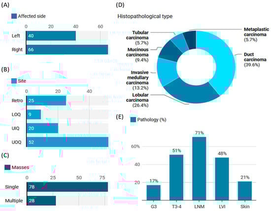 Clinical presentation of BC women with blood samples (n = 106). (A) Counts of affected sides. (B) Counts of affected locations. (C) Counts of patients according to the number of masses at the time of presentation. (D) The different histopathological types. (E)Pathology-related data of patients with BC and provided blood samples. G3: Grade 3, T3-4: stage 3-4, LNM: Lymph node metastasis, LVI: lymphovascular infiltration.