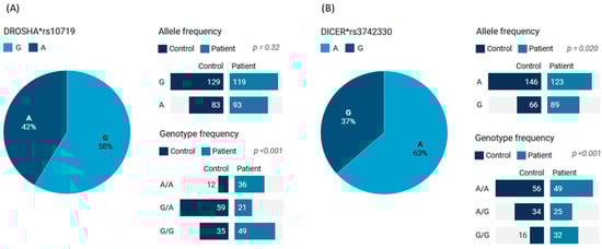 Minor allele frequencies were 0.42 for the DROSHA A and 0.37 for the DICER G alleles. As shown in Figure 7, the most common genotype in patients was DROSHA*G/G, accounting for 46.2% (n = 49), whereas in controls, the heterozygote form A/G was the most prevalent (n = 59, 55.7%); p < 0.001. As for the DICER genotype, A/A was the most frequent in patients (n = 49, 46.2%) and controls (n = 56, 52.8%). However, G/G carriers were twice as common as in controls (30.2% vs. 15.1%, p < 0.001).