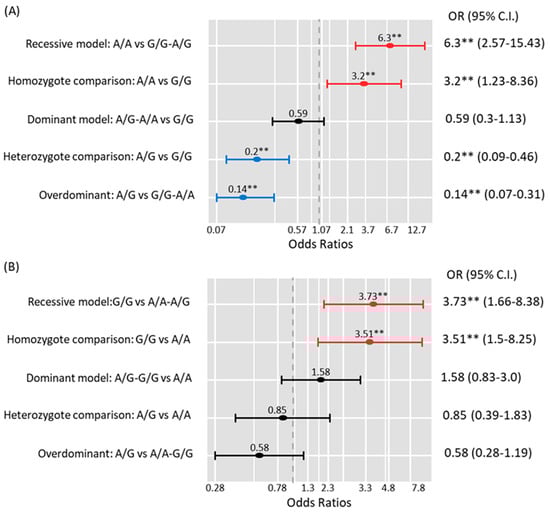 Genetic association models for disease risk assessment: (A) DROSHA rs10719; (B) DICER rs3742330. Multivariate regression models were performed and shown as odds ratios (ORs) and 95% confidence intervals (95%CI). Adjusted variables were patient age at diagnosis, marital status, occupation, a family history of cancer, prior breast problems, smoking, body mass index, diabetes, hypertension, and hepatitis C virus infection. The red line is a risky genotype, the blue line is a protective genotype, and the black line is insignificant. ** indicate significance at p-value < 0.05.