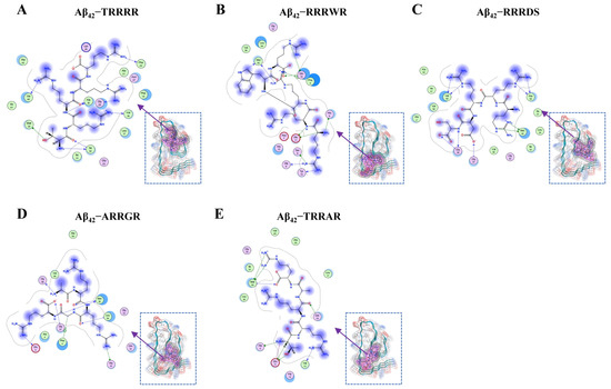 Molecular docking of the five pentapeptides with Aβ42. (A) Binding of TRRRR with Aβ42. (B) Binding of RRRWR with Aβ42. (C) Binding of RRRDS with Aβ42. (D) Binding of ARRGR with Aβ42. (E) Binding of TRRAR with Aβ42. For clarity, only three strands taken from Aβ42 pentamer are shown in this figure. The magenta mesh represents the molecular surface of the pentapeptides, and the gray mesh represents the boundary of van der Waal’s force. Arrows indicate the hydrogen bonds. TRRRR: Threonine-arginine-arginine-arginine-arginine; RRRWR: Arginine-arginine-arginine-tryptophan-arginine; RRRDS: Arginine-arginine-arginine-aspartic acid-serine; ARRGR: Alanine-arginine-arginine-glycine-arginine; TRRAR: Threonine-arginine-arginine-alanine-arginine.