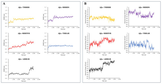 The binding stability and interaction energy of the pentapeptides at different hydrophobic regions. (A) The binding stability of pentapeptides to Aβ42 pentamer. (B) The interaction energy between Aβ42 pentamer and the pentapeptides. RMSD: The root mean square deviation of the positions of the heavy elements of a pentapeptide. The interaction energy is the algebraic sum of Lennard-Jones and Coulombic potential energy. TRRRR: Threonine-arginine-arginine-arginine-arginine; RRRWR: Arginine-arginine-arginine-tryptophan-arginine; RRRDS: Arginine-arginine-arginine-aspartic acid-serine; ARRGR: Alanine-arginine-arginine-glycine-arginine; TRRAR: Threonine-arginine-arginine-alanine-arginine.