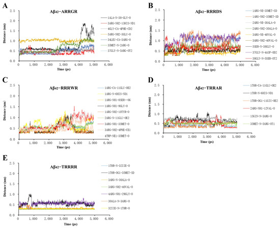 The RMSD fluctuated at a higher value after 1.0 ns and then steadily attained a stable plateau (Figure 2A). The average RMSD of Aβ42 pentamer displayed limited change in the presence of pentapeptides which indicates stable binding of the pentapeptides with the Aβ42 pentamer. Also, the interaction energy of pentapeptides with Aβ42 (Figure 2B) was relatively stable. The conformational change of Aβ42 is mainly affected by electrostatic and hydrophobic interaction forces including hydrogen bonds [40]. The hydrogen bond formed when Aβ42 interacts with ligand can effectively prevent the generation of hydrogen bond between Aβ42−Aβ42 and inhibit the formation of Aβ42 aggregates [41]. Hydrogen bonds can form hydrogen bonds over long distances in the range of 0.5 nm. The gmx distance calculates the distance between two locations as a function of time. Each selection specifies an independent set of distances to be calculated. The gmx distance instruction was executed in the protein–ligand interaction analysis window of GROMACS (2020.03) to run the distance between atoms of hydrogen bond interaction between tripeptide and pentapeptides ligands and Aβ42 monomer. The results of the hydrogen bond distances are shown in Figure 3 and Figure 4. The distances of the five pentapeptides were all less than 2.0 nm in 5 ns time. The hydrogen bond distance between TRRRR and the atoms of the Aβ42 docking complex (Figure 3E) was maintained at about 0.3 nm and 0.6 nm, and the interacting hydrogen bond was generally stable. The hydrogen bond distance formed between the atoms of ARRGR and Aβ42 bonding complex (Figure 3A) changes by microwave during the running time of 4 ns to 5 ns, showing a tendency to increase the hydrogen bond distance, suggesting that the binding between ARRGR and Aβ42 may be unstable; further molecular biology experiments are needed to verify this.