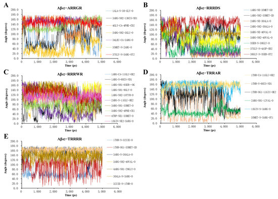 The gmx angle can be used to calculate the angle distribution of multiple angles or dihedral angles. A hydrogen bond is easier to form when the angle between the donor atom, hydrogen atom, and acceptor atom is greater than 120° [42]. The index file command can be executed to specify hydrogen bond atoms and the gmx angle command can be run to calculate the angle between the atoms of hydrogen bond interacting between a pentapeptide ligand and Aβ42. The results of the angles of the hydrogen bonds are shown in Figure 4. The hydrogen bond angles formed between the atoms of ARRGR or TRRRR and the Aβ42 docking complex (Figure 4A,E) are mostly greater than 120°, which means that hydrogen bond formation between pentapeptide ARRGR or TRRRR and Aβ42 monomer is relatively easy. It may affect the formation of hydrogen bond between Aβ42− Aβ42 to potentially inhibit Aβ42 aggregation.