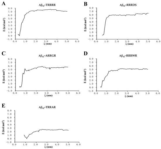 From results obtained from the umbrella sampling free analysis of peptides binding to Aβ42, TRRRR had the highest free binding energy curve (Figure 5), indicating that it bound more firmly to Aβ42 compared to the other peptides. The higher energy value indicates that more energy was required to pull TRRRR from Aβ42. After TRRRR, RRRDS and ARRGR also had higher binding energies than RRRWR and TRRAR.