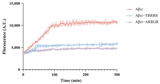 Amyloid aggregation was evaluated using the amyloid dye Thioflavin-T (ThT) [38]. Aβ42 (QYAOBIO, Shanghai, China) was dissolved as previously reported by Yuan et al. [30]. The Aβ42 was adjusted to a final concentration of 10 μM, the pentapeptides (TRRRR and ARRGR) adjusted to a final concentration of 40 μM, and ThT adjusted to a final concentration of 50 μM. These were all carried out in a 96-well plate. The fluorescence intensity was measured at 37 °C using an automated well plate reader (TECAN Infinite 200 PRO, Tecan Asia Pte Ltd., Singapore) at an emission wavelength of 485 at a 5 min interval, with an excitation wavelength of 450 nm. The measurements were performed as independent quintuplicates.