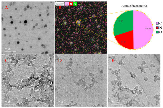 Effect of pentapeptides on aggregation of Aβ42 detected by transmission electron microscopy. (A) Transmission electron microscopic images of 10 μM Aβ42 before incubation. (B) The Atomic Fraction of Aβ42 detected by HAADF-STEM imaging. (C) Transmission electron microscopic images of 10 μM Aβ42 incubated for 48 h. (D) Transmission electron microscopic images of 10 μM Aβ42 co-incubated with 40 μM TRRRR for 48 h. (E) Transmission electron microscopic image of 10 μM Aβ42 co-incubated with 40 μM ARRGR for 48 h.