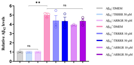 Effects of TRRRR and ARRGR on Aβ42 protein expression. Aβ42–: SH-SY5Y cells not secreting Aβ42; Aβ42+: SH-SY5Y cells secreting Aβ42. The results are expressed as means ± SD; ns: insignificant; ** p < 0.01; the results were analyzed by one-way ANOVA, followed by the Tukey–Kramer test for multiple comparisons, with n = 3.