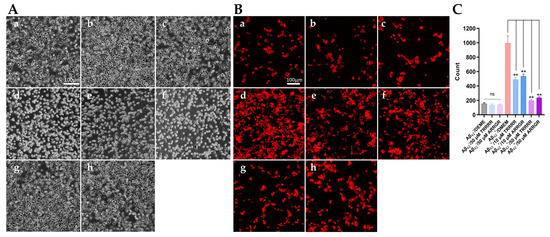 Effects of TRRRR and ARRGR against cell toxicity of Aβ42 secreted from SH-SY5Y. (A) The morphology of SH-SY5Y cells secreting Aβ42. Round-shaped cells with a bright edge are dying or dead. (B) Damaged cells detected with ethidium bromide, a nuclei acid tracer that cannot pass through an intact cell membrane. (C) Quantification of cell damage by using Image J. Results are expressed as means ± SD with ** p < 0.01, and were analyzed by one-way ANOVA, followed by the Tukey–Kramer test for multiple comparisons, n = 3; ns: insignificant. In (A,B): (a) SH-SY5Y control cells that do not secrete Aβ42. (b) The control cells treated with TRRRR at 50 μM. (c) The control cells treated with ARRGR at 50 μM. (d) SH-SY5Y cells secreting Aβ42. (e) Aβ42-secreting SH-SY5Y cells treated with 10 μM TRRRR. (f) Aβ42-secreting SH-SY5Y cells treated with 10 μM ARRGR. (g) Aβ42-secreting SH-SY5Y cells treated with 50 μM TRRRR. (h) Aβ42-secreting SH-SY5Y cells treated with 50 μM ARRGR.