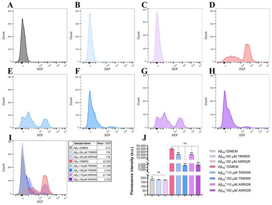 Effects of the pentapeptides on ROS levels in SH-SY5Y cells secreting Aβ42. (A) ROS levels in the SH-SY5Y control cells that do not secrete Aβ42. (B) ROS levels in the control cells treated with 50 μM TRRRR. (C) ROS levels in the control cells treated with 50 μM ARRGR. (D) ROS levels in SH-SY5Y cells secreting Aβ42. (E) ROS levels in the Aβ42-secreting cells treated with 10 μM TRRRR. (F) ROS levels in the Aβ42-secreting cells treated with 10 μM ARRGR. (G) ROS levels in the Aβ42-secreting cells treated with 50 μM TRRRR. (H) ROS levels in the Aβ42-secreting cells treated with 50 μM ARRGR. (I) Overlay of the flow cytometry plots (A–H). (J) Quantification of the ROS levels in the cells. Results are expressed as means ± SD, ns: not significant, ** p < 0.01, by one-way ANOVA, followed by the Tukey–Kramer test for multiple comparisons, with n = 3.