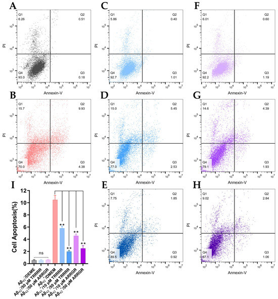 Effects of pentapeptide on apoptosis of SY-SY5Y cells secreting Aβ42. (A) Apoptosis in the SH-SY5Y control cells that do not secrete Aβ42. (B) Apoptosis in the control cells treated with 50 μM TRRRR. (C) Apoptosis in the control cells treated with 50 μM ARRGR. (D) Apoptosis in SH-SY5Y cells secreting Aβ42. (E) Apoptosis in the Aβ42-secreting cells treated with 10 μM TRRRR. (F) Apoptosis in the Aβ42-secreting cells treated with 10 μM ARRGR. (G) Apoptosis in the Aβ42-secreting cells treated with 50 μM TRRRR. (H) Apoptosis in the Aβ42-secreting cells treated with 50 μM ARRGR. (I) Overlay of the flow cytometry plots (A–H). (J) Quantification of apoptosis in the cells. Results are expressed as means ± SD; ns: not significant, ** p < 0.01; results were analyzed by one-way ANOVA, followed by the Tukey–Kramer test for multiple comparisons, with n = 3.