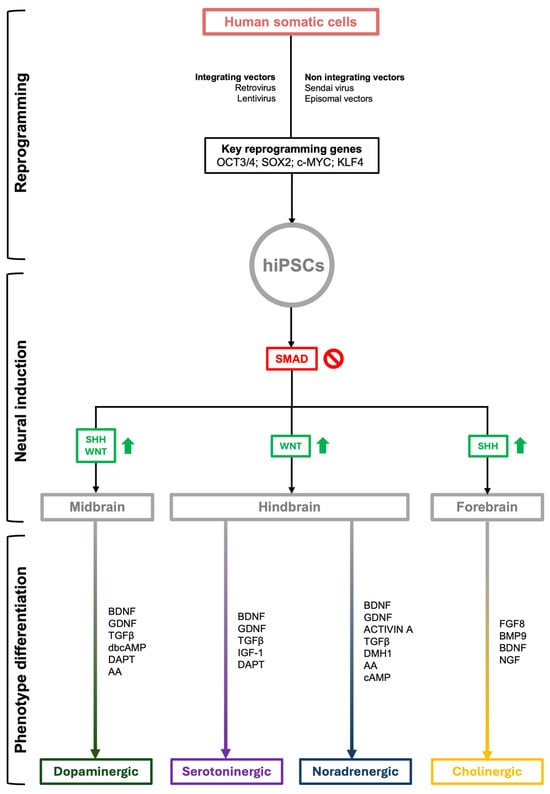 The initial step of neural induction of iPSC is common for cells that are destined to acquire DA, NA, 5HT, and Ach fate and is based on the SMAD inhibition approach [62,63,64,66,67,68,69,71,72,73,74,76,77,81,87,88,89,91,92,93,94,97,98,100,101,102,103,104,105,106,107,108]. This step allows the generation of neural progenitors with forebrain identity [72,109], using small molecules that suppress transforming growth factor (TGF)-β pathways such as SB431542 [110] and the inhibitors or antagonists of bone morphogenetic proteins (BMPs) LDN193189, dorsomorphin, and noggin [111]. After forebrain induction, in order to generate progenitors with forebrain, midbrain, and hindbrain identity, the modulation of the sonic hedgehog (SHH) and WNT signaling pathways is essential [72,109]. Modulation of the SHH pathway is frequently performed using the same SHH or agonists, including purmorphamine and fibroblast growth factor 8 (FGF8) [62,63,64,65,66,67,68,69,71,72,74,76,77,81,82,83,84,87,88,89,91,92,93,94,97,98,101,102,103,104,105,106,107,108,109,112], and is used in 5HT and Ach neuron phenotype induction, after TGF-β and BMP inhibition, to induce the ventralization of hindbrain precursors [65,72,89,102,105]. For activation of the WNT pathway, the small compound CHIR99021, a potent inhibitor of GSK3b, is used in many protocols to promote the neural induction of progenitors of a variety of cell types, including DA, 5HT, and NA neurons [62,63,65,66,67,68,69,71,72,73,74,87,88,89,91,92,94,97,98,100,104,106,107,109]. During 5HT neural induction, in order to promote hindbrain precursor generation, rather than CHIR99021, Valiulahi et al. (2021) used retinoic acid, which, through the modulation of HOX family genes, controls hindbrain activation in a concentration-dependent manner [113]. In methods aiming at DA neural induction, the activation of the WNT pathway with CHIR99021 is widely used in combination with SHH or the aforementioned agonists [62,63,66,67,69,71,74,87,88,91,92,94,97,98,104,106,107,109], and promotes the expression of transcription factors Foxa2 and Lmx1a, which are involved in the midbrain specification of neural progenitors [114,115]. In this process, WNT signaling plays a crucial role compared with the SHH pathway. Indeed, it has been observed that the administration of SHH or agonists alone, in the absence of WNT activators, leads to a low expression of Foxa2, without any effects on Lmx1a [109]. In order to obtain NA neural progenitors, Tao et al. employed the WNT agonist CHIR99021 during the early phase of neural induction, following SMAD inhibition, to achieve the expression of midbrain differentiation-specific factors. Subsequently, by using different concentrations of the same molecule, they induced neural precursors towards a hindbrain identity [100].