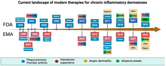 Timeline of biological drugs and Janus kinase inhibitors acceptance by the Food and Drug Administration and the European Medical Agency. Created with BioRender.com.