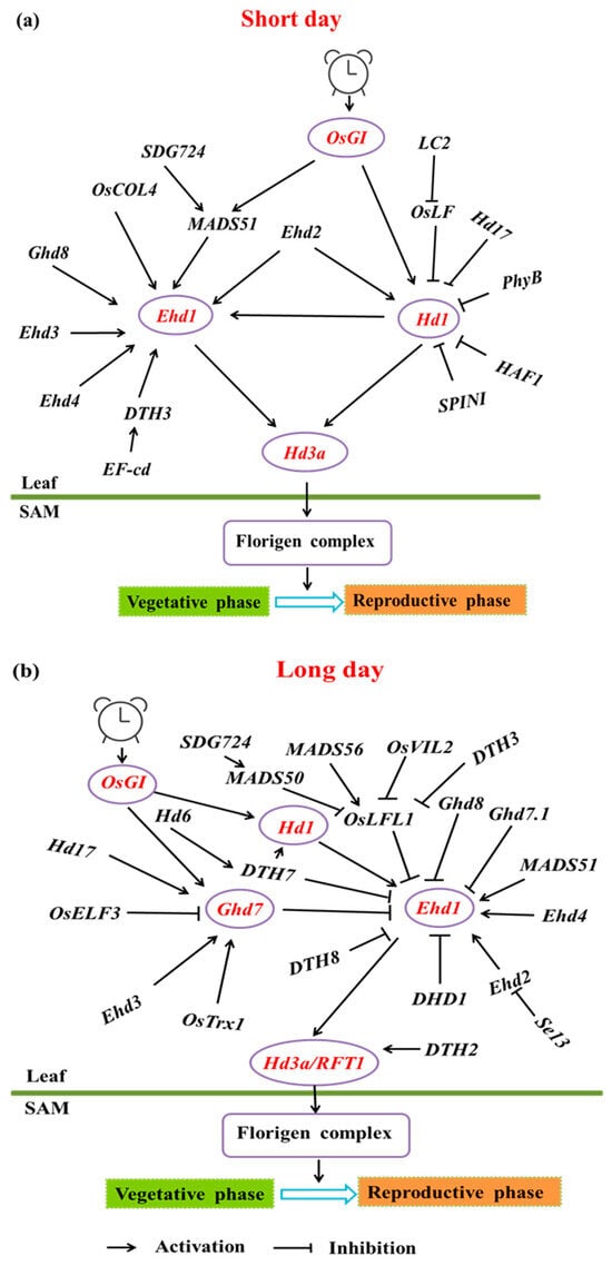 Photoperiodic regulatory pathway of rice flowering. (a) Under short-day conditions, OsGI activates Hd1 and Ehd1, which promote the expression of the florigen gene Hd3a, triggering the transition from the vegetative to the reproductive phase. Various genes, such as Ghd8, OsCOL4, and MADS51, regulate Ehd1 and Hd1, either enhancing or repressing their effects. (b) Under long-day conditions, OsGI activates Hd1, which represses Hd3a, while Ehd1 activates Hd3a/RFT1 to promote flowering. Other genes, including Ghd7, DTH7, and OsTrx1, modulate this pathway by controlling Hd1 and Ehd1 activity.