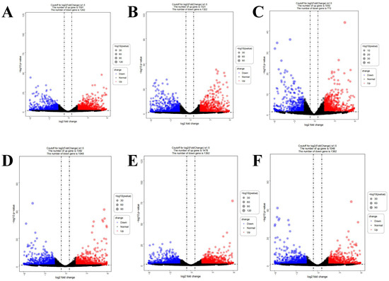 Analysis of differentially expressed genes among tubers of different potato varieties. adj.p-value < 0.05 and log2Foldchange > 1.5 is considered to up-regulate expression, marked with red dots; adj.p-value < 0.05 and log2Foldchange < −1.5 is considered to down-regulate expression, marked with blue dots. (A): HJG_ vs. _JZS8, (B): HJG_vs._QS9, (C): HJG_ vs. _RR, (D): QS9_ vs. _JZS8, (E): RR_ vs. _JZS8, (F): RR_ vs. _QS9.