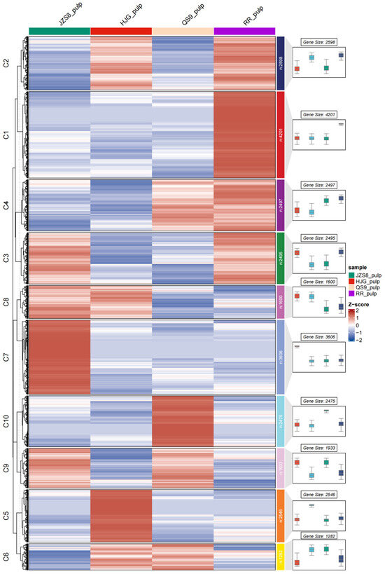 Hierarchical clustering analysis can cluster genes with similar expression patterns in the transcriptome into the same gene cluster for analysis and screening of genes with consistent expression in time, tissue, etc., and genes in clusters are more likely to have functional similarities. In this study, a hierarchical clustering analysis was performed according to the expression levels of differentially expressed genes in four different materials, and all genes were divided into 10 clusters (Figure 4). There were 2598 genes and 1933 genes in C2 and C9, respectively, showing consistent expression patterns, and the trends between the two clusters were opposite. In addition, the expression trends of genes in C2 and C9 showed an inverse correlation (positive or negative correlation) with pigment accumulation. Studies have found that the MYBs gene family is an important transcription factor family that regulates anthocyanin synthesis in plants. Using the same method, this study conducted a hierarchical clustering analysis on the expression of 255 StMYBs genes in four different materials (Figure 5). The results indicated that genes in C2 might be more influential in pigment accumulation in potato tubers.