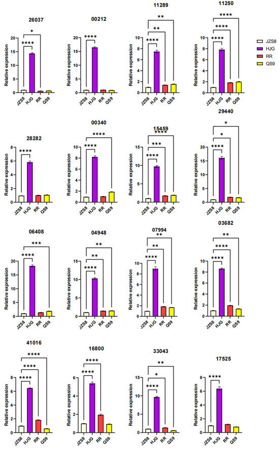 In our study, we focused on 16 MYB genes selected based on their high correlation with anthocyanin biosynthesis-related genes. This selection was informed by co-expression analysis, where these MYB genes exhibited correlation coefficients greater than 0.9, with genes directly involved in anthocyanin synthesis. This strong correlation suggests a potential regulatory role in the anthocyanin biosynthetic pathway. The expression levels of these 16 MYB genes (PGSC0003DMG400026037, PGSC0003DMG400028282, PGSC0003DMG400006408, PGSC0003DMG400041016, PGSC0003DMG400000212, PGSC0003DMG400000340, PGSC0003DMG400004948, PGSC0003DMG400016800, PGSC0003DMG400011289, PGSC0003DMG400015459, PGSC0003DMG400007994, PGSC0003DMG400033043, PGSC0003DMG400011250, PGSC0003DMG400029440, PGSC0003DMG400003682, and PGSC0003DMG400017525) were quantitatively analyzed across different potato cultivars (Figure 8). Notably, genes such as PGSC0003DMG400026037, PGSC0003DMG400028282, PGSC0003DMG400006408, and PGSC0003DMG400041016 showed substantially higher expression levels in the purple HJG and red RR cultivars compared to JZS8. This elevated expression in colored potato varieties, particularly in those rich in anthocyanins (HJG and RR), reinforces the potential role of these MYB genes in modulating anthocyanin production and, consequently, the flesh color of potatoes. These results highlight the importance of MYB transcription factors in the anthocyanin biosynthesis pathway and their potential as key molecular targets for the genetic manipulation and breeding of potato cultivars with specific color attributes.