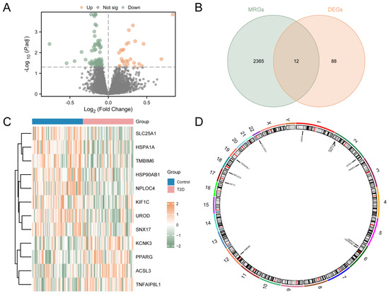 Differential Gene Expression Analysis for Combined Datasets. (A) Volcano map analysis of differentially expressed genes between the T2D group and the control group using the integrated GEO dataset. (B) Venn diagram of DEGs and MRGs from the integrated GEO dataset. (C) MRDEGs in the integrated GEO dataset. (D) Chromosomal localization of MRDEGs. T2D, Type 2 Diabetes; DEGs, Differentially Expressed Genes; MRGs, Mitophagy-Related Genes; MRDEGs, Mitophagy-Related Differentially Expressed Genes. Blue represents the control group, and pink represents the T2D group.