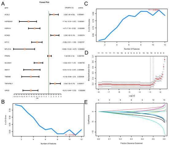 Diagnostic Model of T2D. (A) Forest plot of 12 MRDEGs included in the logistic regression model used to generate the diagnostic model of T2D. The number of genes with the lowest error rate (B) and the number of genes with the highest accuracy (C) obtained using the SVM algorithm are visually displayed. The diagnostic model diagram (D) and variable trajectory diagram (E) of the LASSO regression model. T2D, Type 2 Diabetes; SVM, Support Vector Machine; IncNodePurity, Increase in Node Purity; LASSO, Least Absolute Shrinkage and Selection Operator.