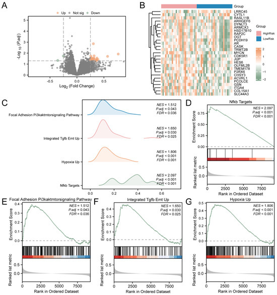 GSEA for Risk Groups. (A) DEGs in the high-risk and low-risk groups of T2D samples were analyzed and presented as volcano plots. (B) Correlation heat map of DEGs in T2D samples. (C) GSEA results of T2D samples presented as four biological function mountain maps. (D) GSEA showed that T2D significantly affected NF-κB targets (D), focal adhesion and the PI3K–AKT–mTOR signaling pathway (E), integrated TGF-β EMT up (F), and hypoxia up (G). T2D, Type 2 Diabetes; GSEA, Gene Set Enrichment Analysis. The screening criteria of gene set enrichment analysis (GSEA) were adj.p < 0.05 and FDR value (q value) < 0.25.