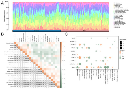CIBERSORT [32] uses linear support vector regression principles to deconvolution the transcriptome expression matrix, allowing for the estimation of immune cell composition and abundance in mixed cells. Using the CIBERSORT algorithm, the LM22 feature gene matrix was integrated, and the data were filtered to include only the immune cell enrichment fraction greater than zero. The final results of the immune cell infiltration matrix are obtained. Finally, the correlation heat map was drawn using the R package pheatmap to show the correlation analysis results of the LM22 immune cells themselves and MRHGs with LM22 immune cells.